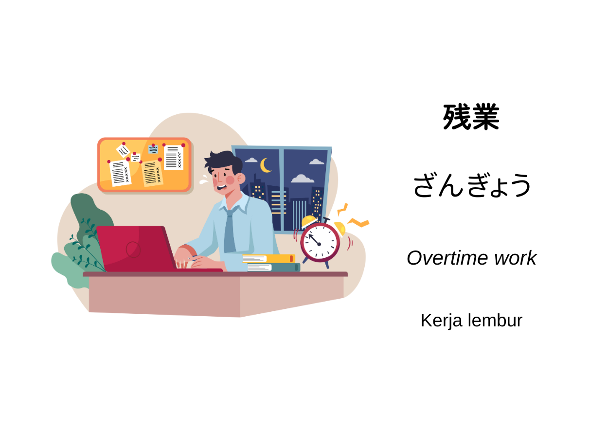 残業(ざんぎょう, zangyō)artinya tetap tinggal bekerja setelah melewati jam kerja yang telah ditentukan. Istilah ini berarti bekerja melebihi jam kerja yang ditetapkan oleh perusahaan maupun melebihi jam kerja legal yang diatur oleh Undang-Undang Standar Ketenagakerjaan di Jepang. Untuk 残業 di luar dari batas yang ditetapkan hukum, maka upah lembur harus dibayarkan oleh perusahaan ke pekerja.
