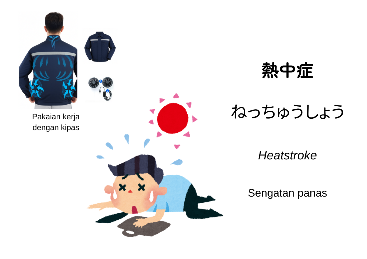 Di Jepang 熱中症 dianggap sebagai salah satu risiko kesehatan paling serius di musim panas, dan setiap tahun menyebabkan banyak kasus darurat hingga kematian. Sebagai pekerja asing, terutama yang bekerja di lapangan atau belum terbiasa dengan iklim Jepang, kita wajib menjaga kondisi tubuh agar tidak mengalami dehidrasi, misalnya dengan minum air secara teratur, bahkan saat tidak merasa haus. Kemudian minum juga minuman yang mengandung elektrolit (ion drink) saat berkeringat banyak. Kita juga wajib menggunakan peralatan keselamatan yang sesuai, misalnya topi pelindung (helm) dengan pelapis penahan panas, pakaian kerja yang ringan dan menyerap keringat, dan lainnya. Langkah yang saat ini paling umum dan efektif adalah pakaian kerja yang dilengkapi kipas dibagian bawah. Sekarang di Jepang, hampir semua orang yang bekerja di luar ruangan dalam waktu lama mengenakan pakaian tersebut. Waspadalah terhadap gejala dini 熱中症, jika merasa tidak enak badan, segera berhenti bekerja dan lapor ke atasan.