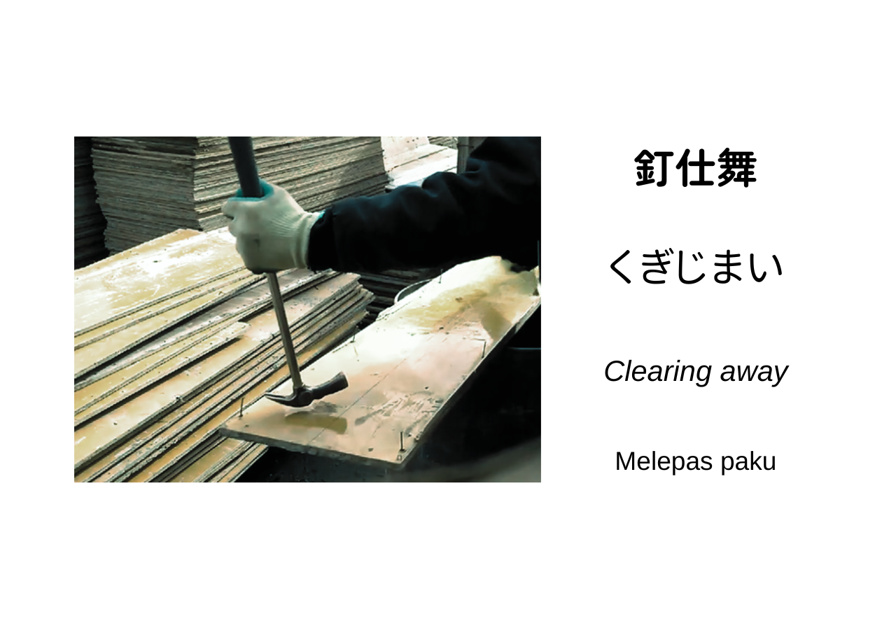 釘仕舞(くぎじまい, kugi-jimai) artinya kegiatan membereskan paku setelah pembongkaran bekisting atau melepas paku dari papan atau komponen bekisting agar material bisa dipakai ulang dan area kerja kembali rapi.