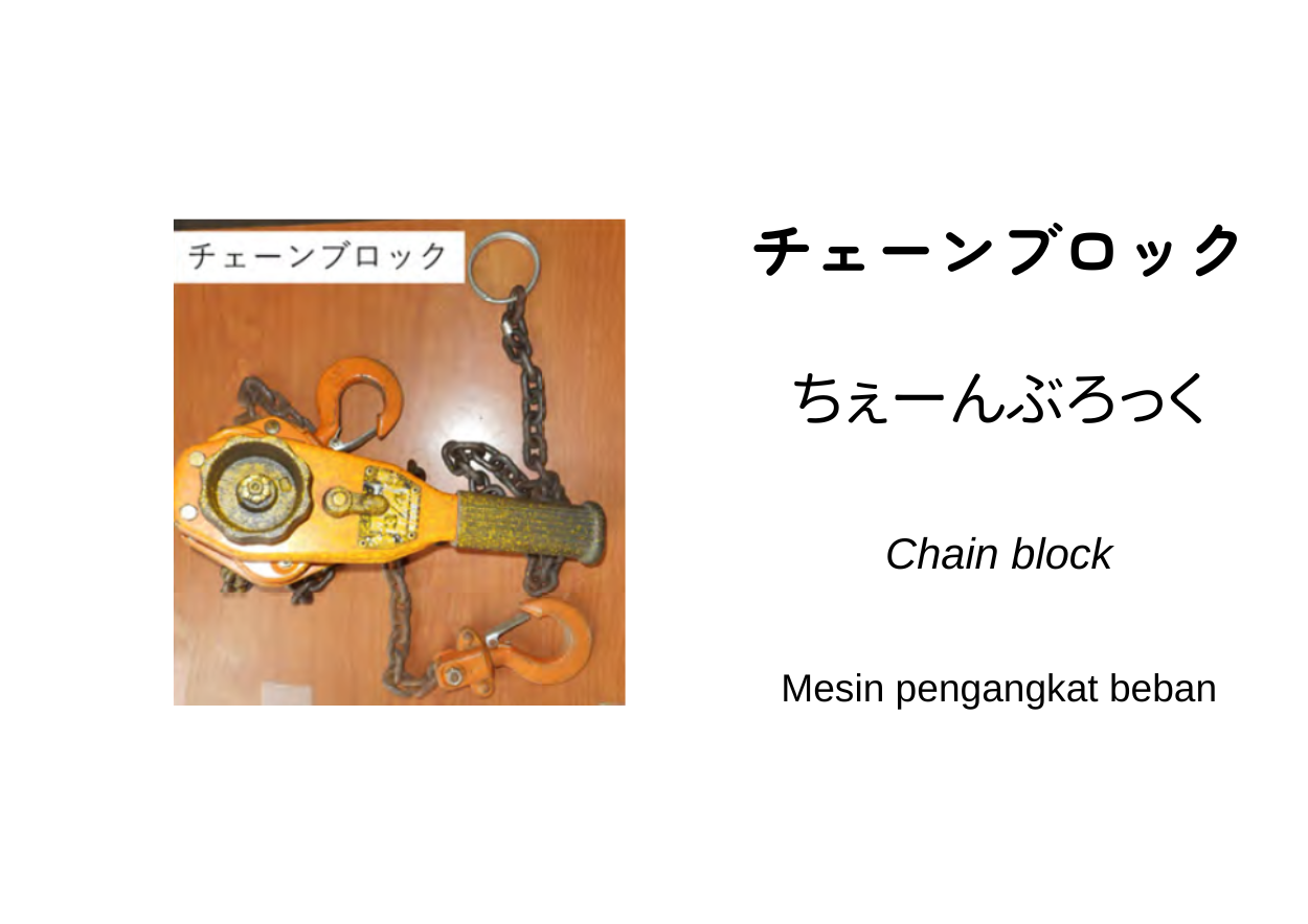 Dengan memasang チェーンブロック pada langit-langit lokasi kerja atau pada penyangga seperti tripod, benda berat dapat diangkat dan bahkan dipindahkan dalam keadaan tergantung. Selain untuk mengangkat, alat ini juga dapat digunakan untuk menarik keluar pondasi beton yang tertanam atau akar pohon.