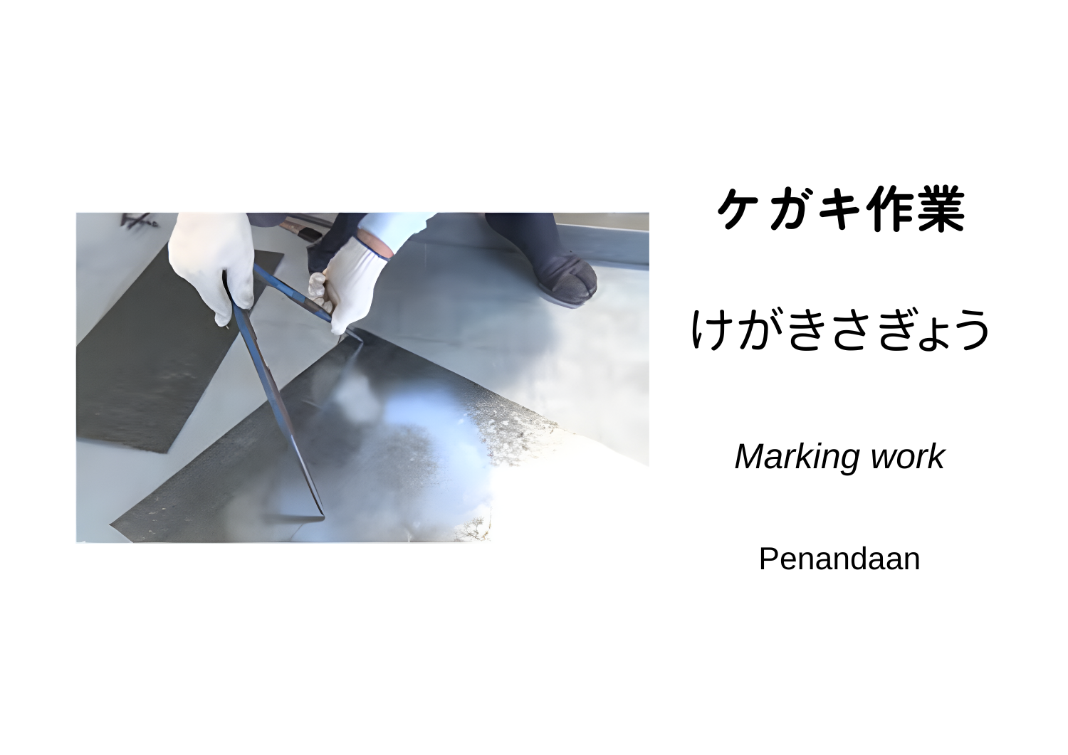 Pada bangunan struktur baja, rangka baja yang telah diproses sebelumnya di pabrik disambung dan dipotong di lokasi proyek sambil membangun bangunan. Dengan memberi tanda ケガキ pada baja, tujuan utamanya adalah agar para pekerja dapat melakukan penyambungan dan pemotongan secara efisien dan akurat. ケガキ作業 harus dilakukan dengan hati-hati dan presisi sambil memeriksa gambar kerja. Kesalahan kecil saja pada tahap ケガキ dapat menyebabkan pergeseran, pekerjaan ulang, atau bahkan kegagalan pemasangan komponen.